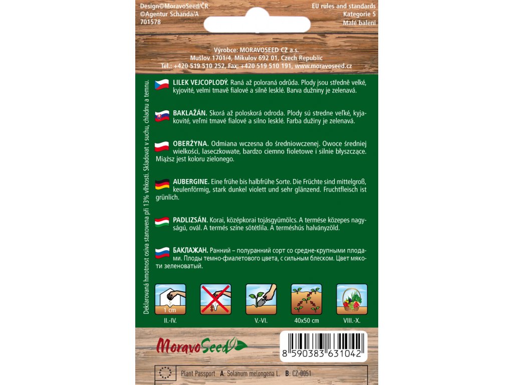 Plody sú stredne veľké, kyjovité, veľmi tmavo fialové a silne lesklé. Farba dužiny je zelenkavá.