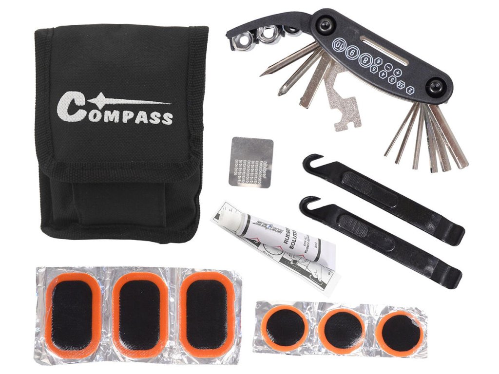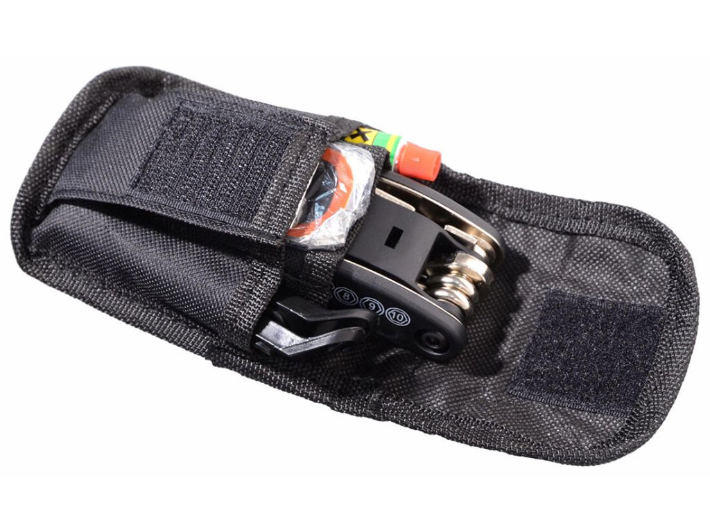 Cyklotaška s náradím. rozmery tašky: 9 x 9 x 4,5 cm sada obsahuje: 1 x puzdro na náradie 4 x stranový kľúč (8, 10, 15 mm + 14 GE) 6 x imbus kľúč (2, 2.5, 3, 4, 5, 6 mm) 2 x skrutkovač (krížový a plochý) 2 montpáka na výmenu duše 6 x záplata na duši 1 x lepidlo na duše 1 x brúsny pliešok na duše Praktická multifunkčná súprava cyklistického náradia a pomôcok na opravu duší v uzatvárateľnej taške.Dodatočné parametre