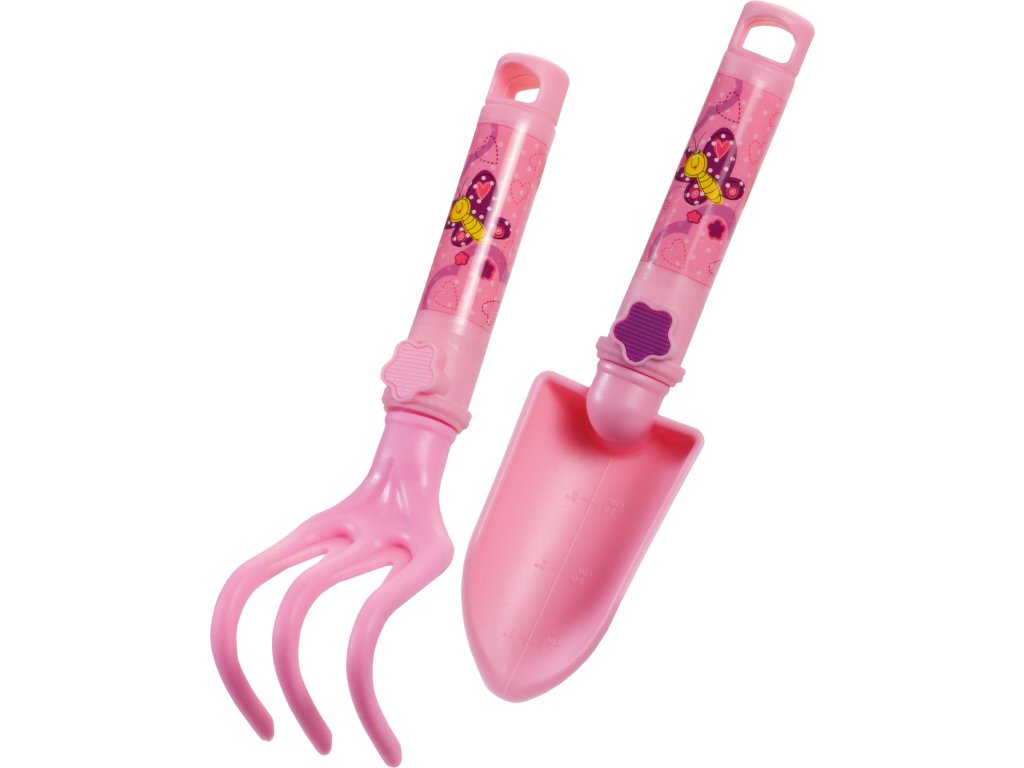 Sada detského náradia v ružovej&farbe - 3-zubé hrabličky + lopatička s násadou s detskými motívmi.