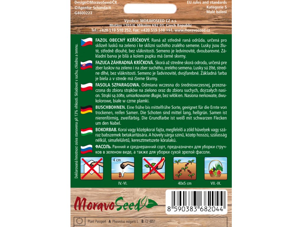 Struky sú žlté, stredne dlhé, bez vláknitosti. Semeno je obličkovité, dvojfarebné. Základná farba je biela a okolo pupka má čierne škvrny.