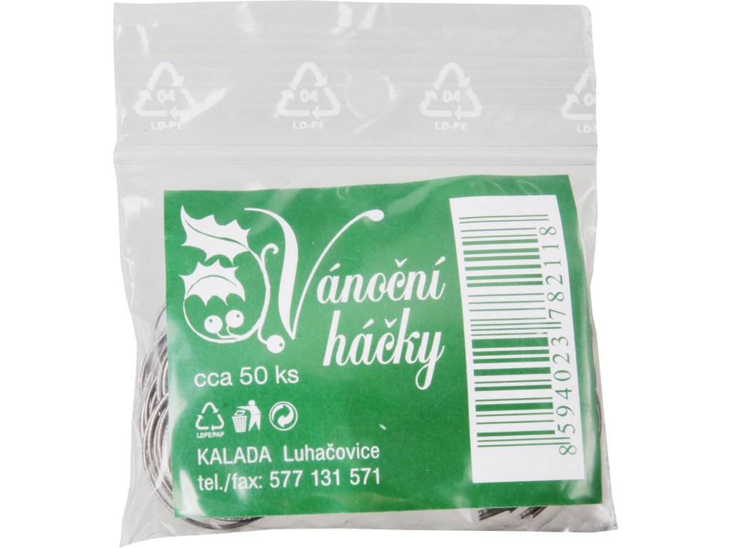 Popis:Vianočné závesné háčiky - železný lesk, dĺžka 5 cm. Balenie obsahuje 50 ks.