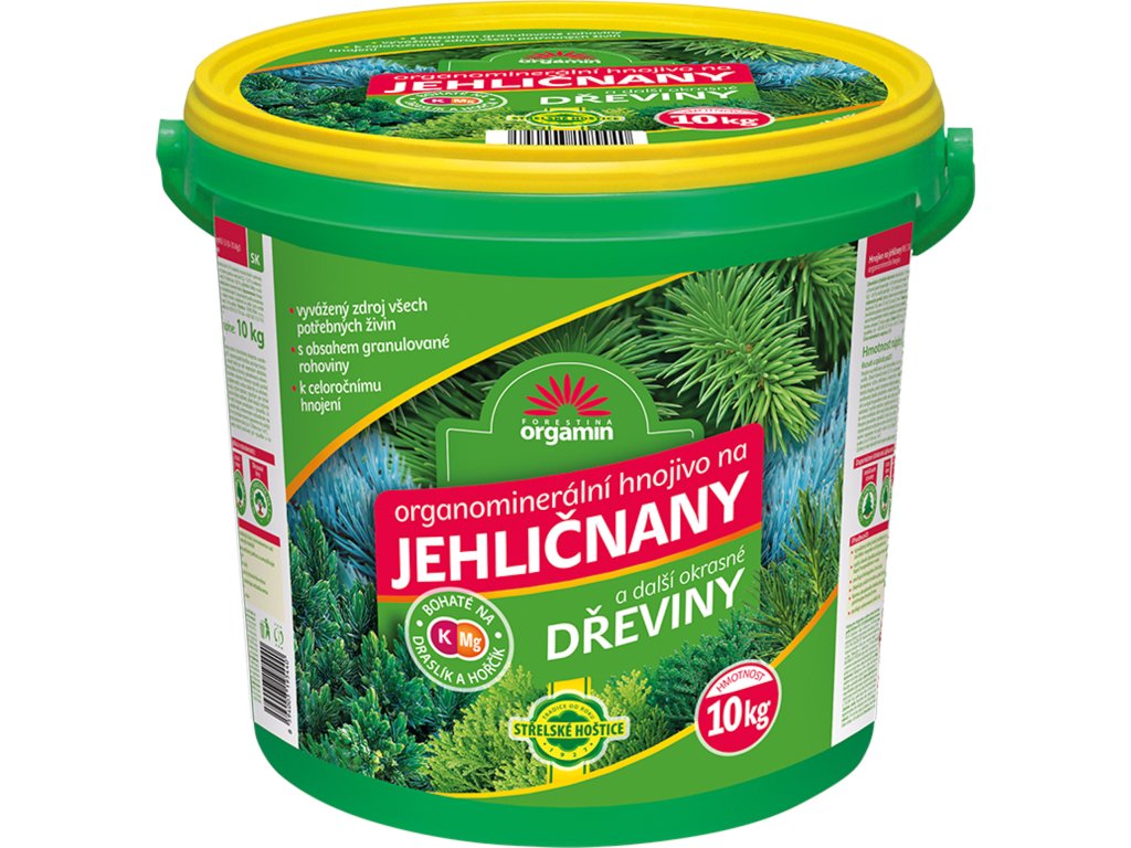 Hnojivo na ihličnany a iné okrasné dreviny je určené na celoročné hnojenie rastlín. Obsah hlavných prvkov (N, P, K) a významný podiel horčíka zaručuje dostatočnú komplexnú výživu ihličnanov a okrasných drevín počas celého vegetačného obdobia. Prednosťou tohto hnojiva, ktorého významnou zložkou je drvená a granulovaná rohovina, je pozvoľné uvoľňovanie draslíka obsiahnutého v rohovine. Pomerne vysoký podiel draslíka má priaznivý vplyv na lepšie hospodárenie rastlín s vodou, takže sú odolnejšie nepriazni počasia a lepšie odolávajú aj vyšším teplotám, typickým pre letné počasie. stromu alebo môžeme pridať do substrátu používaného pri výsadbe, dostatočne zalejeme vodou. 40 - 50 g na m2