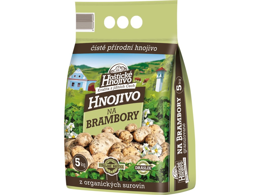 Hoštické organické hnojivo na zemiaky je čisto prírodné hnojivo vyrobené z fermentovaného hydinového hnoja a vinázy. Hnojivo obsahuje organické látky, základné aj vedľajšie živiny (N, P, K, Ca a Mg), ale aj stopové prvky (B, Cu, Fe, Mo, Mn a Zn) ako prirodzenú súčasť použitých surovín. Zloženie hnojiva zaisťuje vyrovnanú a dostatočnú výživu, ktorá priaznivo ovplyvňuje počet, veľkosť i kvalitu hľúz. hľúz a zlepšuje ich skladovateľnosť