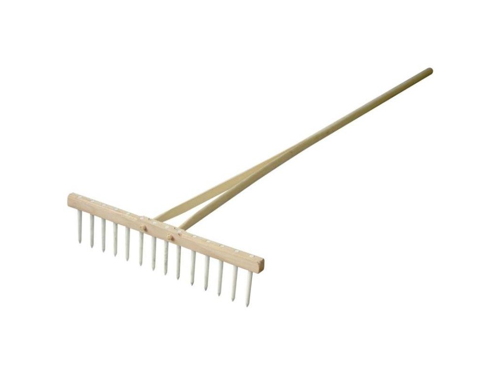 - pevná drevená násada poskytuje pohodlný a stabilný úchop, zatiaľ čo ľahký a odolný plastový hrebeň zaisťuje ľahké hrabanie lístia, trávy a záhradných nečistôt