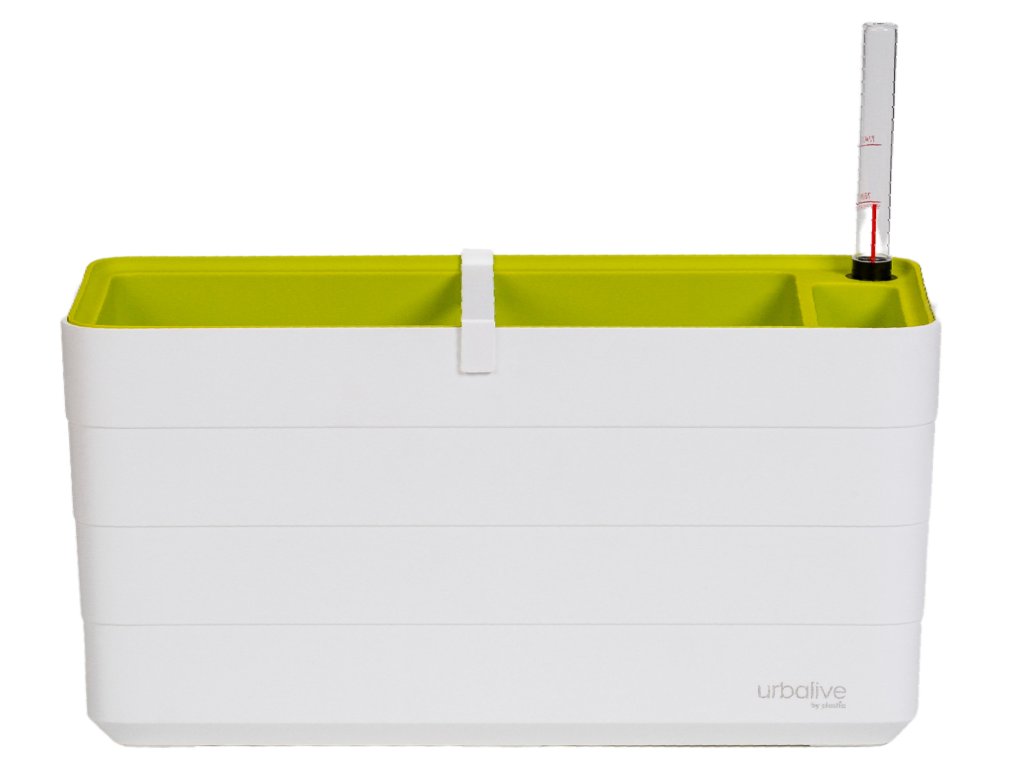 Samozavlažovací kvetináč v modernom a dômyselnom dizajne. Vyrába sa v troch veľkostných variantoch a 6 farebných prevedeniach s netradičnou farebnou vložkou. Zalievanie je bezstarostné - Berberis má veľkú zásobáreň vody s hladinomerom, dostatočne veľký otvor na zalievanie a prepad vody. Hodí sa na pestovanie kvetín, bylín i drobnej zeleniny. Truhlík má objem na 6 l substrátu a zásobu vody max. 3 l. Príslušenstvo: 1x hladinomer + 2x svorka kvetináča + knôty dĺžka: 39,5 cm, šírka: 19,5 cm kombinácia: zelená + biela