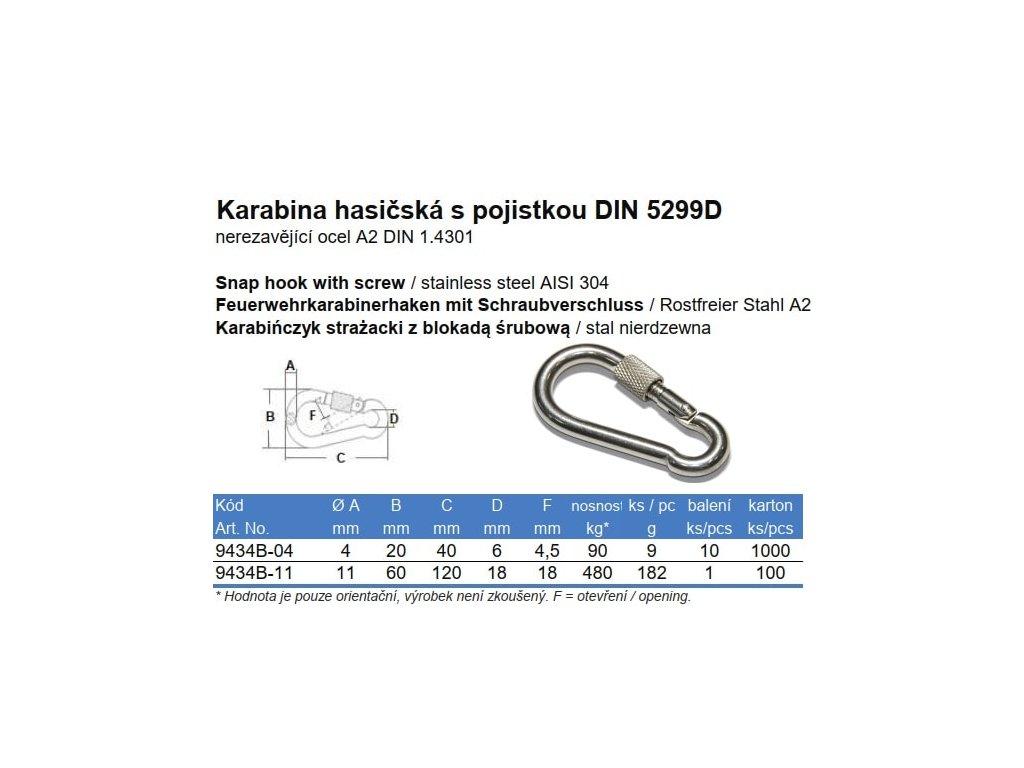 Karabína hasičská s poistkou DIN 5299D nerez A2