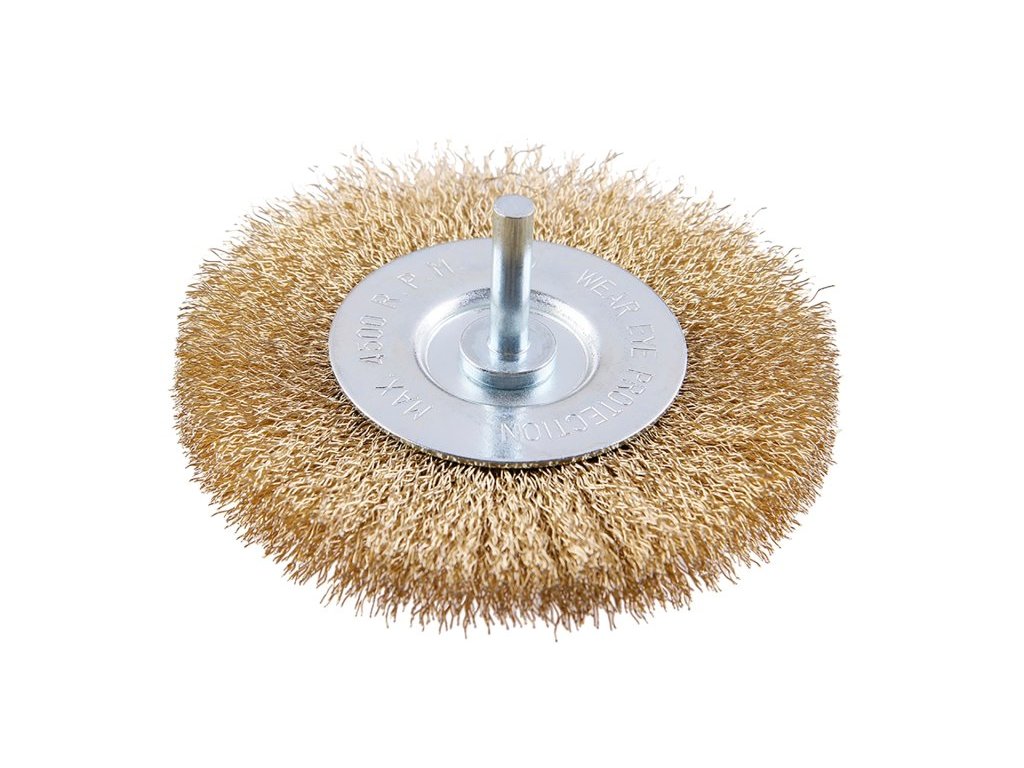 Rotačná kefa - okružná, prevedenie: vlnitý drôt 0,25 mm - pomosadený, priemer 100mm, stopka 6 x 27 mm, pozinkované telo kefy, počet drôtov: 1800, dĺžka drôtu: 23 mm, max. prípustné otáčky: 4500 1/min Použitie: na leštenie, zdrsňovanie, odstránenie hrdze a otrepov.Dodatočné parametre