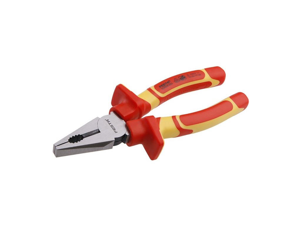 Kliešte VDE kombinované 180 mm FESTA majú certifikáciu elektro VDE 1000 V, IEC/EN 60900-2004, kombinácia polypropylénu a gumy na ergonomicky tvarovaných rúčkach zaručuje výborné antišmykové vlastnosti a dobrú odolnosť voči mazadlám a chemikáliám. Uchopovacie čeľuste obzvlášť odolné proti opotrebovaniu, chrómvanádová vysoko výkonná oceľ. Hmotnosť 0,333 kg.Dodatočné parametre