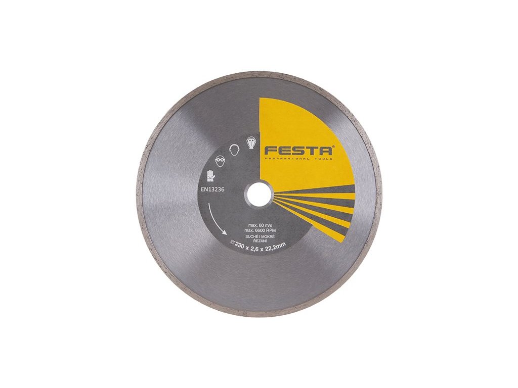 Profesionálny diamantový kotúč FESTA, prevedenie: PLNÝ - celoobvodový, kvalitná diamantová vrstva s vysokým obsahom diamantového prachu, presné spracovanie - napojenie na nosný disk kotúča odolávajúci vysokým teplotám, použitie: určený pre mokré i suché rezanie dlažby a obkladov, betónu, tehál, zdiva : blister s eurootvorom, rozmery : uvedené v názve výrobku.Dodatočné parametre