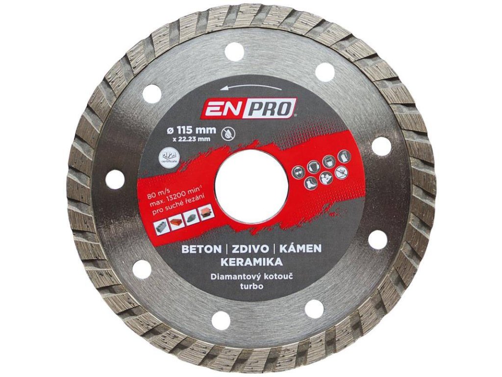- ouče prémiovej značky ENPRO, ktorá je zárukou profesionálnej kvality. ENPRO kotúče vynikajú predovšetkým vysokou kvalitou použitého materiálu a dlhodobou životnosťou. Certifikácia MPA. Turbo kotúče sa využívajú na rezanie rôznych druhov materiálov ako sú: betón, murivo, kameň, keramiku, žulu, mramor. Turbo kotúče sú ideálnym výberom pre kombináciu medzi segmentovým a celoobvodovým kotúčom. Poskytujú hladký rez a dajú sa využiť na rezanie za mokra aj sucha.