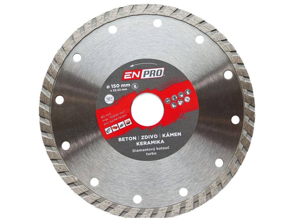 - ouče prémiovej značky ENPRO, ktorá je zárukou profesionálnej kvality. ENPRO kotúče vynikajú predovšetkým vysokou kvalitou použitého materiálu a dlhodobou životnosťou. Certifikácia MPA. Turbo kotúče sa využívajú na rezanie rôznych druhov materiálov ako sú: betón, murivo, kameň, keramiku, žulu, mramor. Turbo kotúče sú ideálnym výberom pre kombináciu medzi segmentovým a celoobvodovým kotúčom. Poskytujú hladký rez a dajú sa využiť na rezanie za mokra aj sucha.