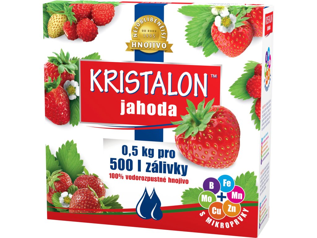 Kristalon jahoda 0,5 kg zaistí rýchlejší počiatočný rast vďaka priamej absorpcii fosforu, rýchlejší nástup produkčného obdobia. Je vhodné pre všetky druhy jahôd pestovaných vo voľnej pôde aj v nádobách. Dávkovanie: 1 odmerka (10g) hnojiva sa rozpustí v 10 l vody a vystačí pre približne 5 m2 plochy. Balenie 0,5kg je určené pre 500 l zálievky celkom.