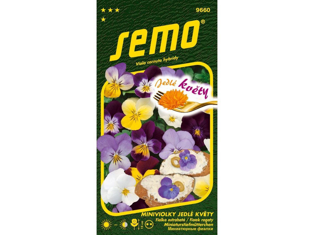 Miniviolka JEDLÉ KVETY - smes má fialové a modrožlté kvety, ktorým sú prisudzované afrodiziakálne účinky a ich sladkastá chuť a oku lahodiaci vzhľad sú priamo určené k ozdobe a dochuteniu zeleninových mís a chlebí.