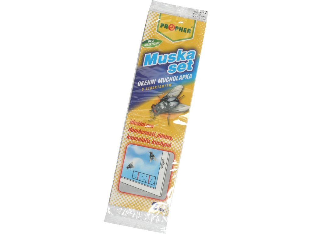Muškaset je okenná mucholapka, kde vrstva kvalitného nestekavého lepidla s atraktantom je nanesená na priehľadnej fólii s grafickými symbolmi (červené pruhy, zobrazené muchy), ktoré zosilňujú atraktivitu prechádzajúceho slnečného svetla pre cieľový hmyz aj. odporúčame výrobok umiestniť na južné okná miestnosti.