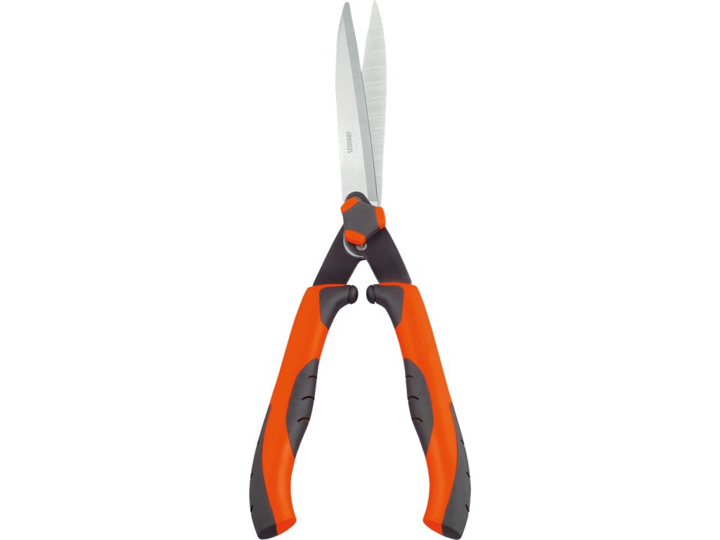 Záhradnícke nožnice určené na strihanie živého plotu, úpravu kríkov a krovín. Vysoko kvalitné nožnice pre využitie v parkoch, okrasných záhradách a škôlkach. Nožnice majú tvrdú chrómovanú čepeľ. Ergonomicky tvarované rukoväte zaisťujú protišmykové držanie a bezpečný úchyt. Hmotnosť nožníc 872 g.