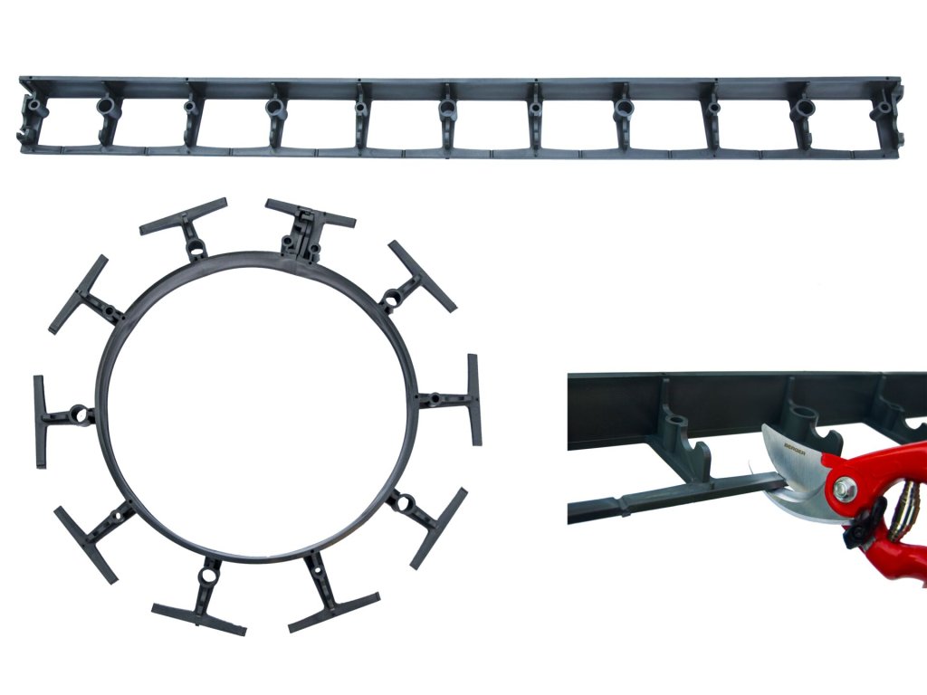 Univerzálny neviditeľný obrubník je možné použiť pre rôzne podmienky, ako napríklad: trávnik, dlažba, betónový chodník, štrk, drvina, kôra. V obrubníku je 10 otvorov pre kotevné klince (je možné použiť plastové aj kovové). V priamke stačí použitie troch klincov.