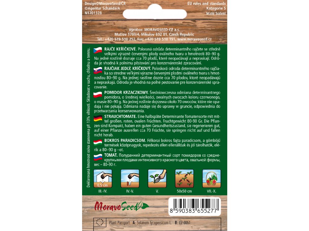 Poloraná odroda determinantnej paradajky so stredne veľkými výrazne červenými plodmi oválneho tvaru s hmotnosťou 80-90 g.