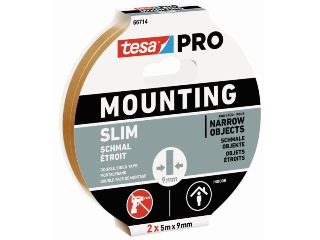 - tesa PRO Mounting Slim– silná a tenká páska– ideálna na použitie v interiéri pri rôznych povrchoch– obojstranná lepiaca vrstva