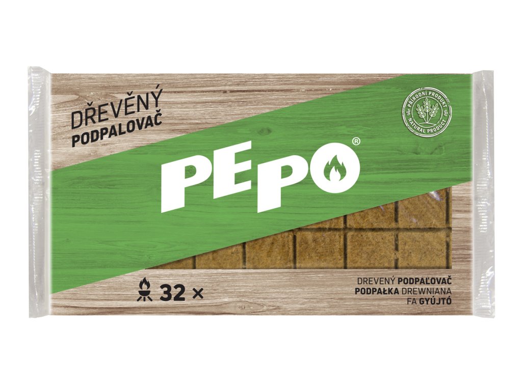 PE-PO drevený podpaľovač, v tvare odlomiteľných dielikov, obsahuje iba lisované drevené piliny a parafín. Zaujímavá alternatíva ku klasickým pevným či tekutým podpaľovačom.