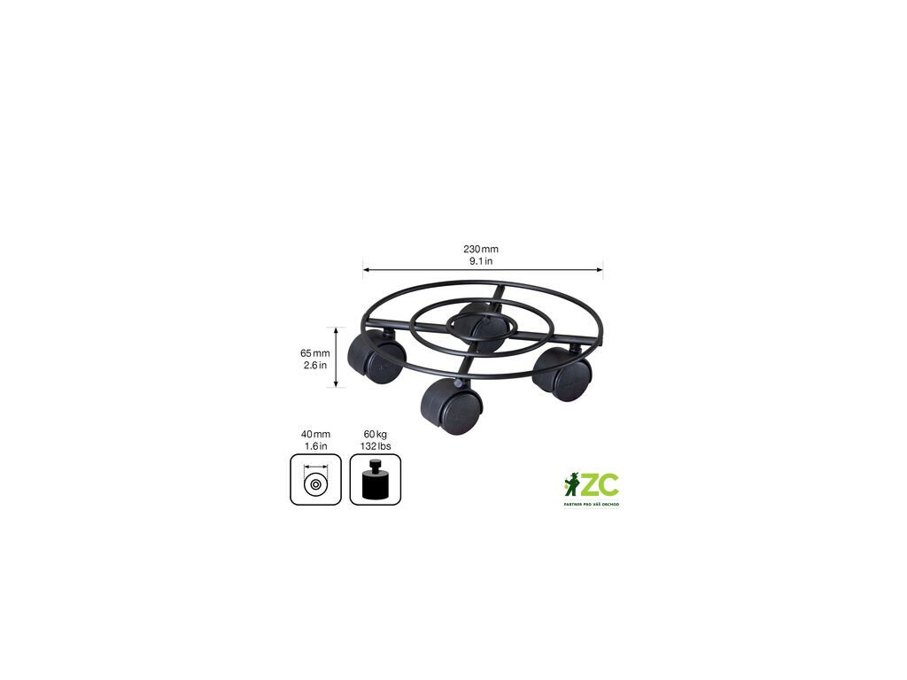 Podložka pod kvetináč vyrobená z ocele so štyrmi otočnými kolieskami, ideálna pre všetky malé a stredne veľké kvetináče. Farba čierna matná, priemer 23 cm, pre vnútorné použitie, nosnosť 60 kg.