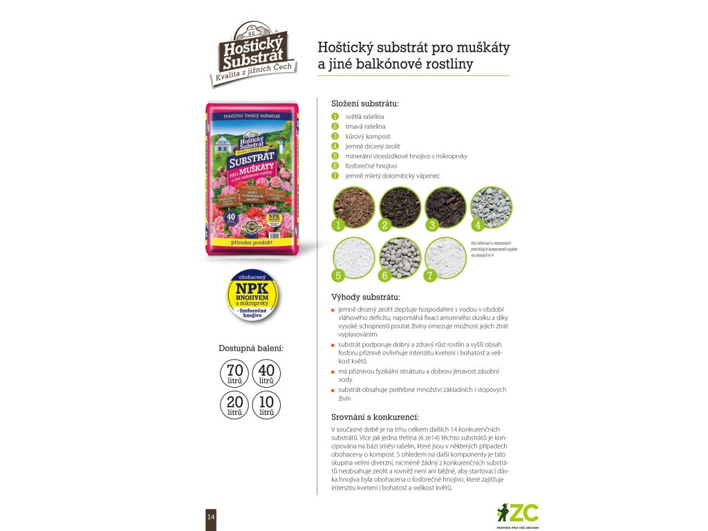 HOŠTICKÝ SUBSTRÁT PRE MUŠKÁTOV A INÉ BALKÓNOVÉ RASTLINY je vyrobený zo zmesi vytriedenej svetlej a tmavej rázneného, rašeliny, dobre kôrového kompostu a jemne drveného zeolitu. K základnému vyhnojeniu substrátu je použité minerálne viaczložkové hnojivá s mikroprvkami. Substrát je ďalej obohatený o fosforečné hnojivo. Pôdna reakcia je upravená jemne mletým dolomitickým vápencom. SUBSTRÁTU:
