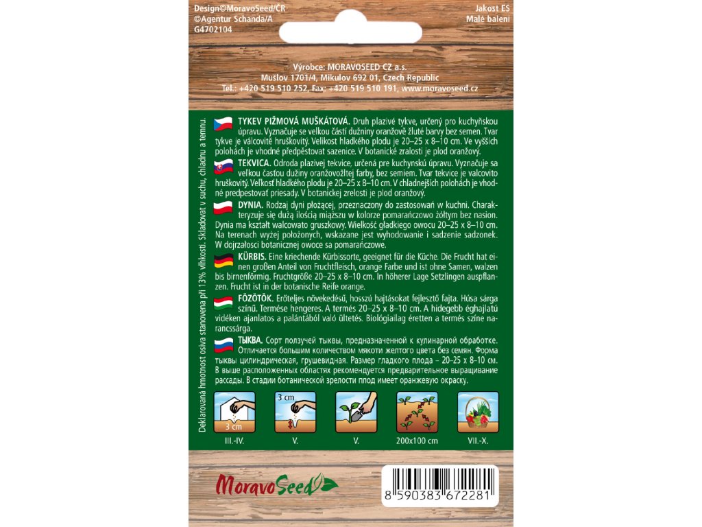 Vyznačuje sa veľkou časťou dužiny oranžovo žltej farby bez semien. Tvar tekvice je valcovito hruškovitý. Veľkosť hladkého plodu je 20-25 x 8-10cm. Vo vyšších polohách je vhodné predpestovať sadenice. V botanickej zrelosti je plod oranžový.