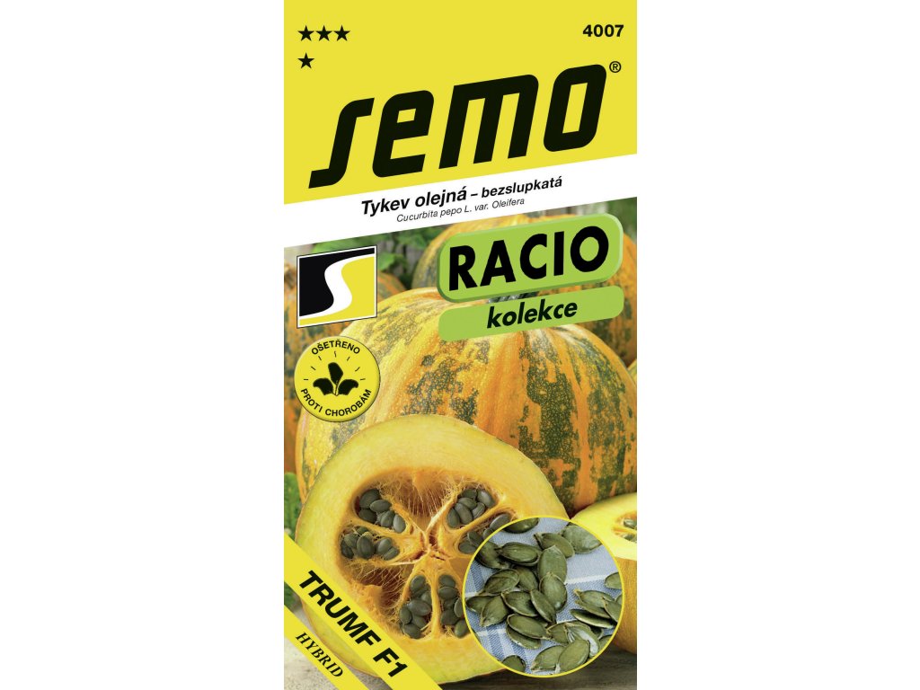 TRUMF F1 (TRUMF F1 (kód 4007) – kolekcia RACIO – tento hybrid tekvice olejnej má tmavé stredne veľké semená, ktoré sú vhodné na priamu konzumáciu aj lisovanie oleja. Vzrast tekvice môžeme označiť ako polokríčkový, čo umožňuje pestovať viac rastlín na menšej ploche. Aj pri hustejšom spone zberáme 3–5 plodov z rastliny. Podmienkou je dostatočné hnojenie a pravidelná závlaha. Poskytuje vysoké výnosy aj v menej priaznivých rokoch.