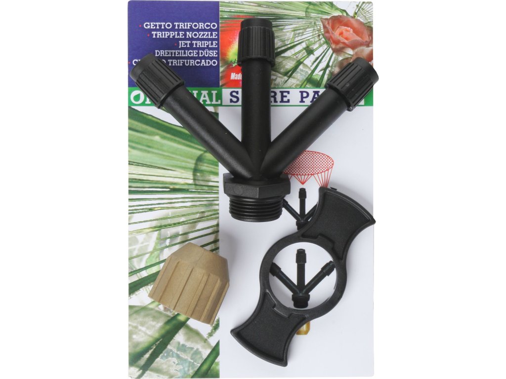 Popis:Tryska trojnásobná rozptyľuje postrek až do uhla 160°. V sade s kľúčom na výmenu trysiek.