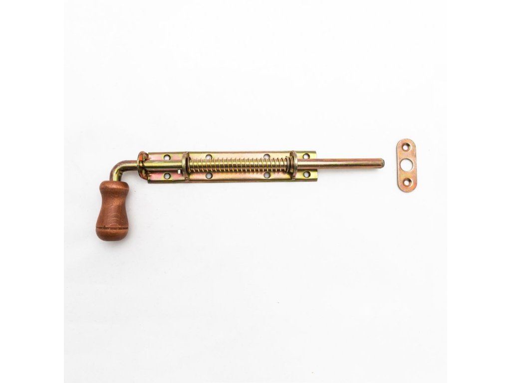 Zástrč pružinová s drevenou koncovkou má celkovú šírku 200mm a výšku 30mm.