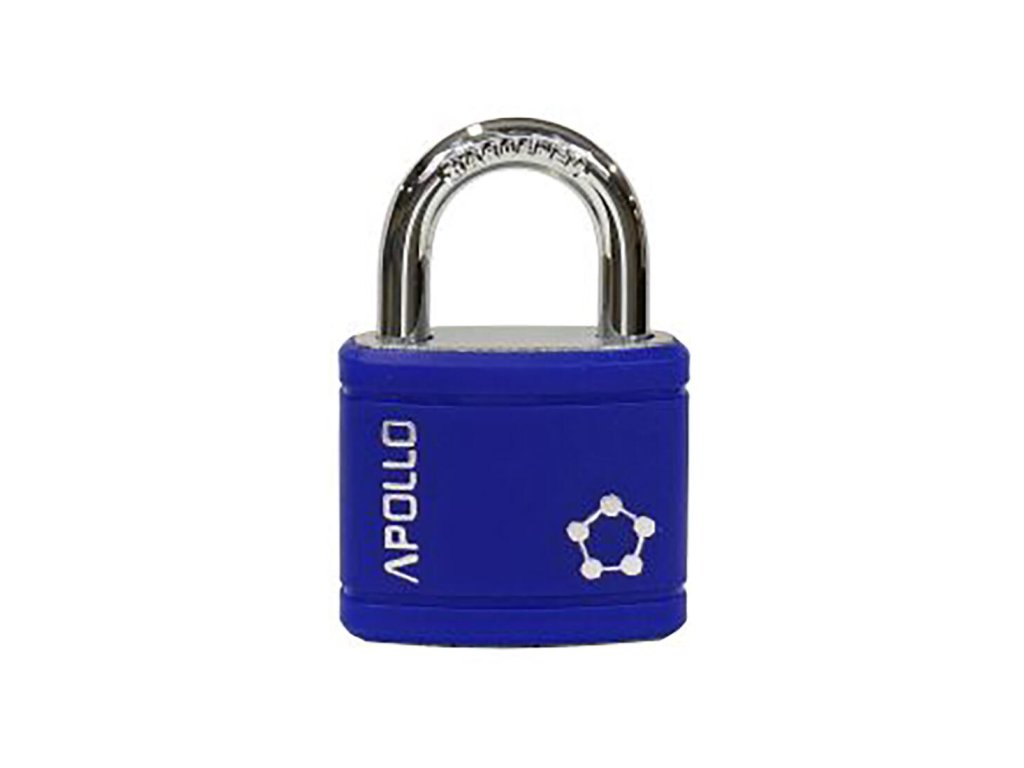 Zámok visiaci APOLLO 35 3 kl. MO. Oceľový visiaci zámok. Práškovo lakované teleso zámku s plastovým krytom. Strmeň zámku HARDENED, istený v dvoch bodoch. Zamykanie bez kľúča – zatlačením strmeňa. Vložka zámku s 5 odpruženými stavítkami. hmotnosť netto: 0,07 kg farba: modrá Balenie vr. 3 ks kľúčov.Dodatočné parametre