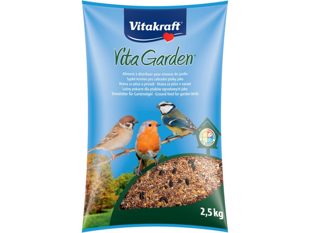 Kompletné krmivo pre záhradné vtáctvo. Krmivo Vita Garden obsahuje lahodné semená, obilné zrná, slnečnicové semienka a vitamíny. Je cenným doplnkom stravy voľne žijúcich záhradných vtákov. Vynikajúce celoročné krmivo pre mnoho vtáčích druhov. Perfektný do kŕmidiel alebo na rozsypanie po zemi. Receptúra bez cukru. Neobsahuje umelé farbivá ani konzervačné látky.