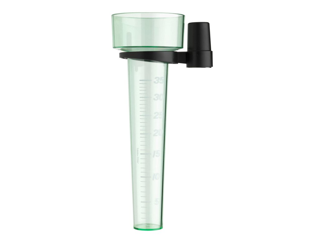 Zrážkomer 8,4 x 24,5 cm. priemer: 8,4 cm výška: 24,5 cm materiál: plast Zrážkomer s držiakom, ktorý umožňuje priamy odpočet úhrnu zrážok zo stupnice vylisovanej na samotnom zrážkomeru.Dodatočné parametre